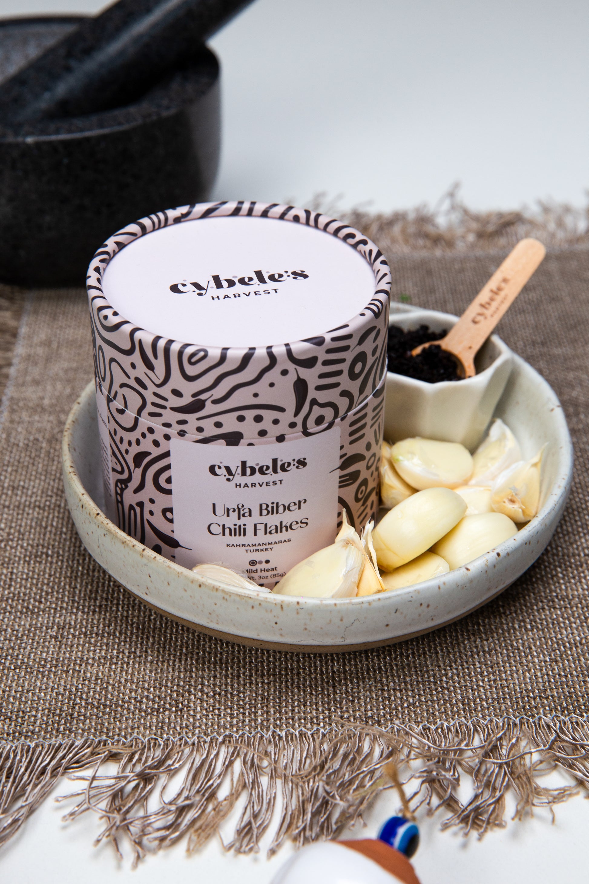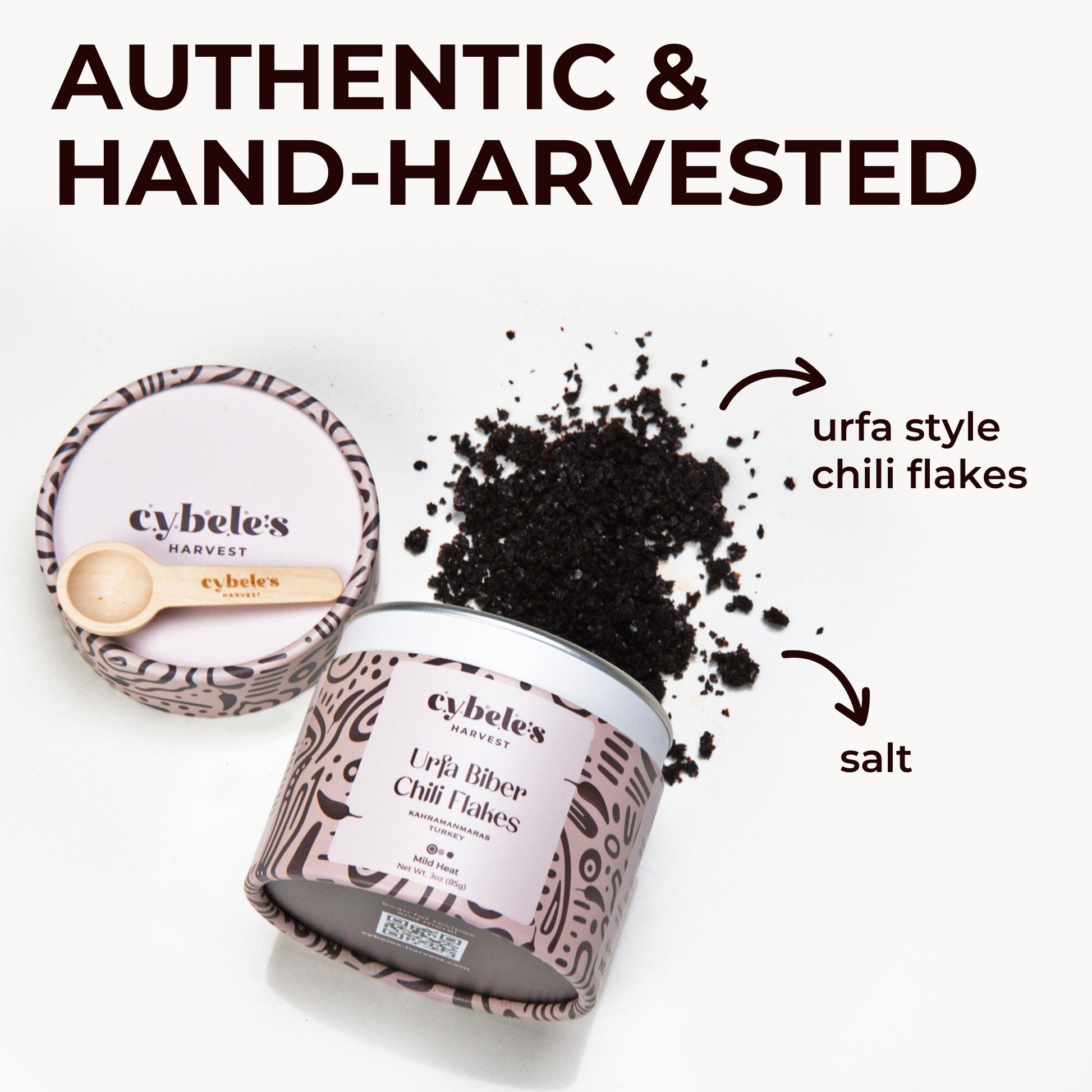 Cybele’s Harvest sources Urfa Biber directly from Turkish farmers in Şanlıurfa, the pepper’s ancestral home. After harvesting, peppers are sun-dried by day and wrapped at night, allowing them to ferment slightly and achieve their signature dark maroon-black color and soft, oily texture.